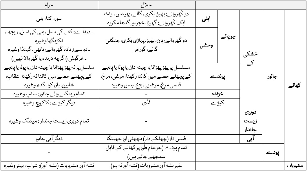 – حلال گوشت والے چوپائے اور پرندوں کو کھانا صرف اس صورت میں جائز ہے کہ انہیں شرعی ذبح (یا شکار) کیا گیا ہو۔